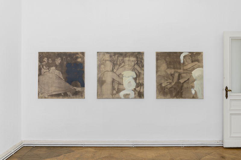 The ten square canvasses by German artist Matthias Groebel, currently on view at Schiefe Zähne, although unambiguously dated between 1987 and 1990, appear to inhabit a moment outside of time. A misalignment of their content and form seems to be producing this peculiar effect. Photographs from the 1980s were printed by Groebel on linen, using a 19th century technique. The gap in chronology between subject matter and methodology is conspicuous, because, if nothing else, it inverts the logic of (digital) restoration, a kind of anachronism that the technologies of today have made commonplace, wearisome at times. By flipping the script in ‘chemical’—this Berlin presentation of early work—Groebel provides a fresh, complicating angle on an era whose depictions are readily assumed intelligible and understood.