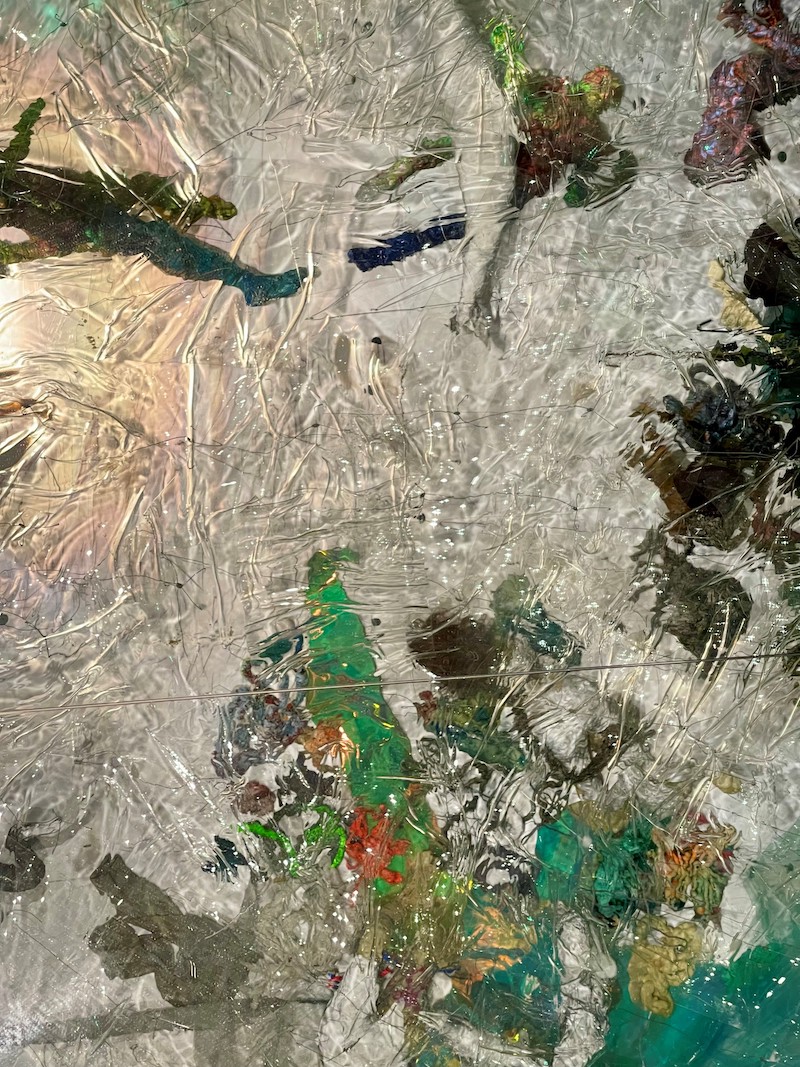 During her early site visits to the Nasher, Golden recalled seeing airplanes reflected in the mirror-clad buildings of Dallas’s post-modern skyline. This context feels particularly compelling for her work, as Dallas itself can resemble a hall of illusions—reflecting and refracting a distorted image of itself, often suggesting more than is actually present. In contrast, her hand-crafted sculpture’s tattered spray foam surfaces (aquatic fauna and human figures) convey a gentle earnestness. These small, expansive scenes depict a sunken world, submerged and perhaps frozen in the aftermath of some fast-moving cataclysm, encasing these delicate forms and suggesting a vulnerability that feels immediate.