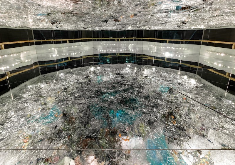 In a darkened lower gallery of the Nasher Sculpture Center, a purpose-built ramp leads visitors to the edge of an architectural kaleidoscope. Inside, painted foam creatures, broken furniture and plastic plants splay outward into the infinite regress that has become Samara Golden’s signature. We are presented with a recursive landscape, half rendered or half decomposed, between dreams and nightmares. Dangling lights catch the breeze from oscillating fans, their flickering reflections adding a dizzying layer to the flooded tangle.