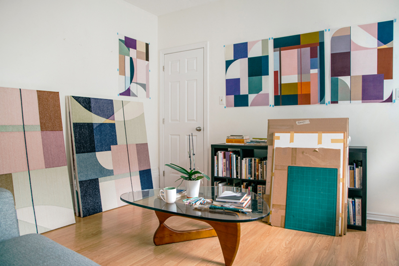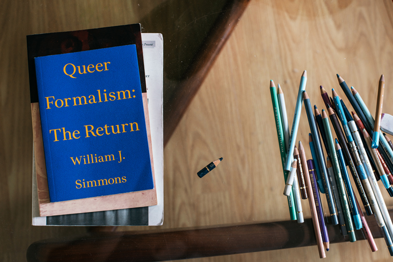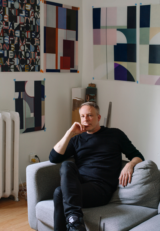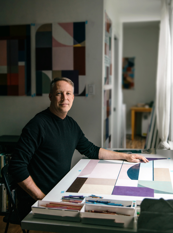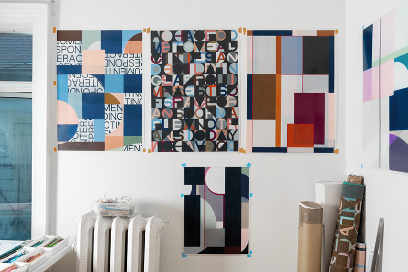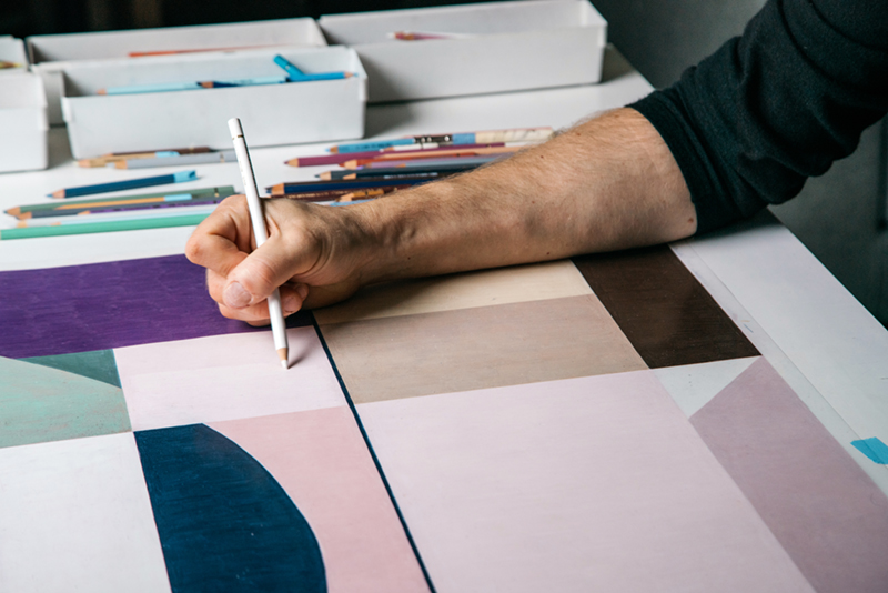 His work explores expansive ideas about what drawing means, conceptually and literally, and suggests how repetitive mark-making in many media, including textiles, photography and video, can abstract what is inherently visible in the constructed world. In contrast to later work, his earliest drawings were figurative, a result of rigorous training in painting and drawing, and careful observation. During a previous studio visit, I was surprised as he pulled out several stunning, sensitive portraits, depictions of close friends rendered with dramatically assured linework. Surprised because, for much of his career, he’s experimented exclusively with abstract fluctuations in shape and colour. In many ways, he’s a modernist through and through, working in what he calls “referential abstraction”—a type of abstraction concerned with the observation and inclusion of real referents that are transformed through detailed, laborious work that disappears those same referents into abstract form. “Modernism was about denying an ideology of realism,” he tells me, “but for me it’s very much about identity, and about my own relationship to the built environment.”