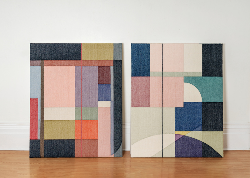 When I meet Monteith in his studio, he’s finishing preparations for the Hunt Gallery exhibition, a collaborative project with sound artist and composer, Lou Sheppard. Titled ‘Signal to Noise,’ it will contain nine large textile works made of hand-tufted wool stretched over wooden frames and hung like paintings. As ever, an expanded definition of drawing-as-process is evident. The works originate with the tools of the architect (pencil, drafting transparencies, blueprints) and are translated through repeated individual acts of mark-making to become luminous, shimmering drawings that pull heavily from the shapes of the built environment. The drawings are then transformed again, enlarged in size and stitched into individual knots of wool.