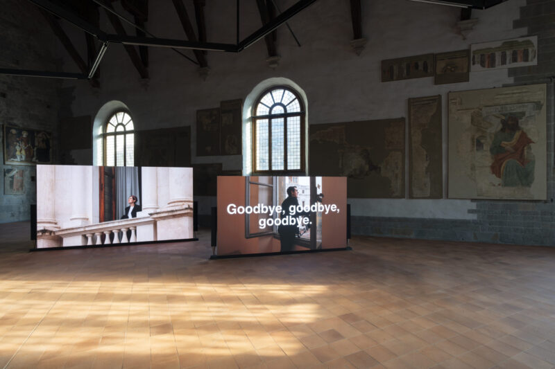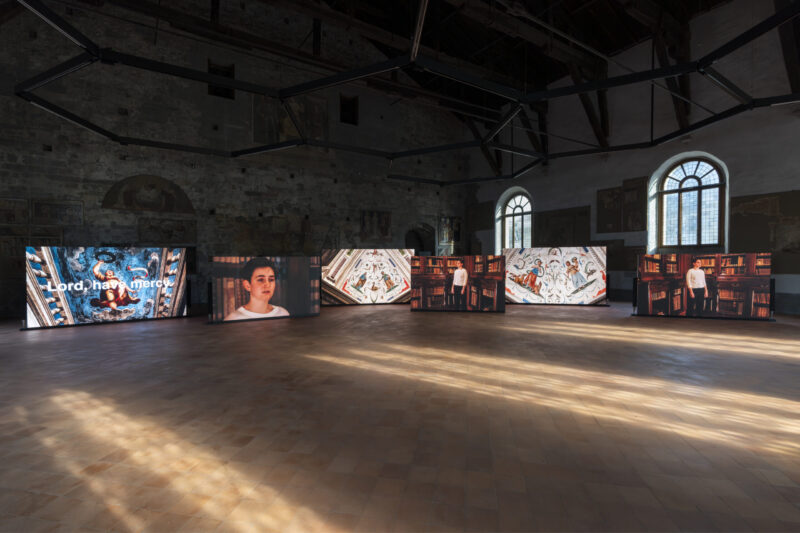The work of the project’s inaugural instalment that (com)passionately takes center stage is also a personal highlight: Sonia Boyce’s ‘Benevolence,’ a site-specific installation for the grand Sala delle Capriate at the Palazzo della Ragione in Bergamo’s old town. Rooted in appreciation for music and sound, Boyce’s relational practice delves into acoustic memory, creating spaces for collective creativity—and thus collectivity—to flourish. On par with the striking venue adorned with 17th-century frescoes (which inspired the title of the installation), six large screens monumentalize a video collage featuring locals and their music tradition. For this project, Boyce focused on Italian folksongs that sublimate social commentary into a musical form, and invited a group of students from Bergamo’s Gaetano Donizetti Higher Institute of Musical Studies to perform and improvise them. The filming took place in emblematic places of encounter: Piazza Vecchia, a historic square next to the exhibition venue, as well as the adjacent Angelo Mai Civic Library and the archive of the San Michele all’Arco book tower that was formerly a place of worship.