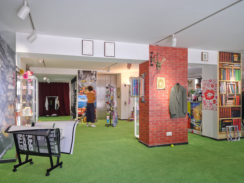 The institution of the state-backed museum tends to behave like a good modernist, in that it affects a performative separation between the exhibited art and the subterranean forces of the market. The exception to this rule, where the geological line between art object and commodity becomes blurred, is the gift shop. The gift shop is supposed to generate loquacious status symbols and to gently remind the visitor of late and neglected relatives that might appreciate a souvenir—a curiously peripheral mix of high culture pretension and shopping mall sentimentality. I say all this because the German artist Christoph Blawert has an altar to maximalist kitsch at the entrance—‘TICK TACK Fancy Museum Shop’—which ought to be taken seriously as an installation in its own right. Taking the place of the Kunsthalle’s normally sparse Bauhaus design, Blawert has constructed a glorified convenience store filled both with twinkling knick knacks and reproduced prints by genuinely talented artists from Antwerp. Like a bodybuilder who’s entered a bulk phase, Blawert assembled the content of the gift shop through a binge of accumulation (in his private life, I was told, he keeps his personal possessions to a strict minimum): there is a bright green, almost turf-like carpet in the entrance, and on the bookshelves, you’ll find tabloid pictures of deceased Belgian royalty and the pop stars of yesteryear. There are multiple customized throw blankets on the couch with the photographs of the teams from TICK TACK and Kunsthalle Recklinghausen. At the end of the exhibition, the curators are also endeared to the visitor in the form of a collectible.
