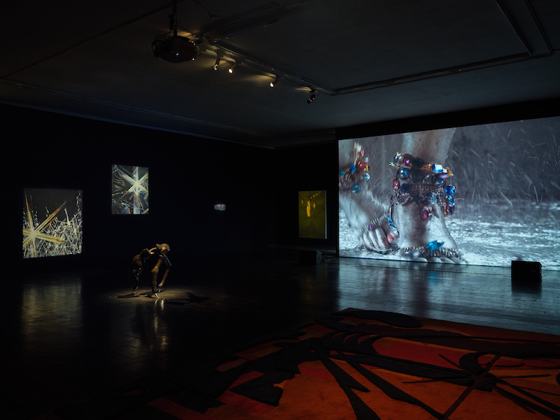 One thing that should be said about the staff of TICK TACK and Kunsthalle Recklinghausen is that they know how to install a pristine exhibition, and whoever managed the technicalities of the lighting on the exhibition’s second floor deserves a raise. The room is set in movie theater darkness for the screening of Marilyn Minter’s ‘Smash,’ a video of a manicured pair of feet, tightly rigged in Jimmy Choos, that shatters a vane of glass serving as the fourth wall between the action and the audience. However, the targeted spotlights give the impression that the remaining artworks stationed around the room are floating out of the darkness toward the viewer, tuning up the eerie aura of a painting like Lenz Geerk’s ‘Vampire’ and the circus-like flexibility of a sculpture like Sally von Rosen’s ‘Miss Universe.’