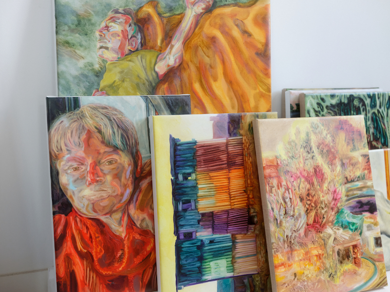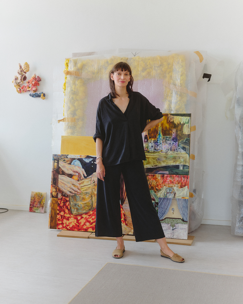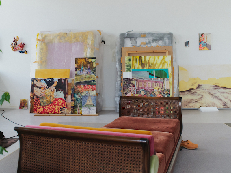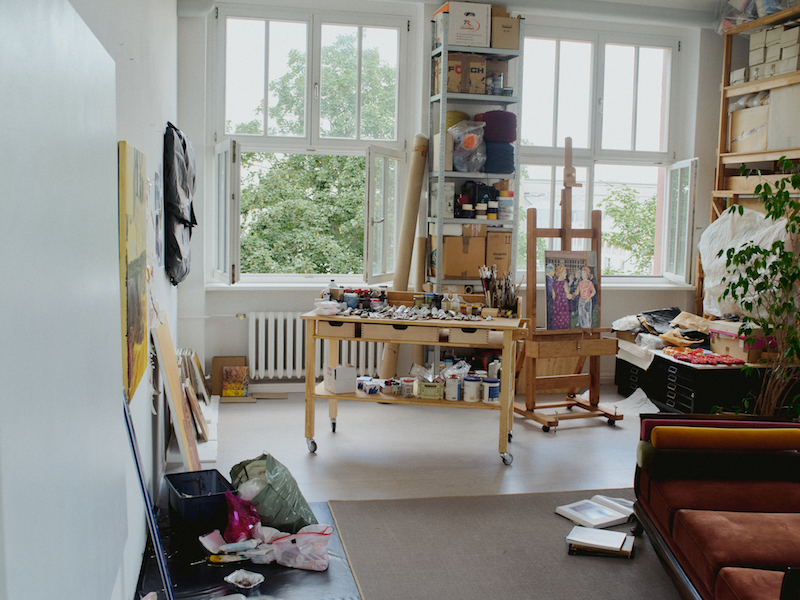 Marianne Thoermer’s studio has the two key ingredients of light and space. The street outside is peppered with trees—from one sounds the high-pitched call of a redstart and its mate. A daybed punctuates the middle of the space: it’s the kind that invites you to lie back and share your dreams or desires. Stacks of books line one side of the studio. Paintings lean against one another in a tightly assorted domino. A couple of works-in-progress are pinned to the wall and a third sits tight in its easel. Thoermer likes to move between more than one painting at a time, approaching whichever one “the energy tilts towards” that day.