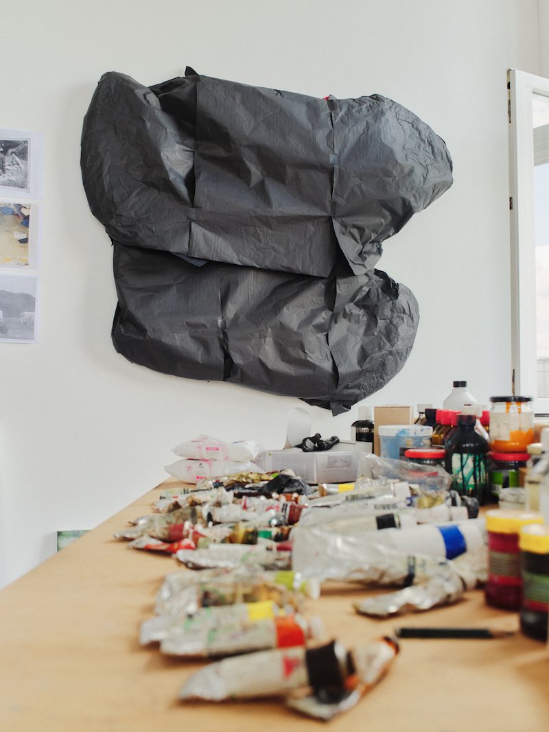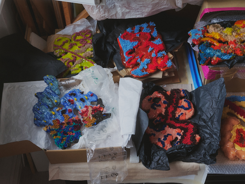 For Thoermer, painting has been a process of return. Over the course of her studies (the artist graduated in 2015), her work in the medium felt “way too flat and didn’t allow the viewer to completely immerse with the work.” Thoermer translated this desire for immersion into large textile installations. She carefully unwraps smaller examples of these, made of woven textures and glass wax. Light blue and deep red, acid green and dusty pink, brown and peachy orange: each piece is its own colourful landscape, the sleekness of the wax ruptured by the unfurling of yarn. Over the course of the pandemic, after a decade’s hiatus, Thoermer returned to painting in a secluded corner of Yorkshire, a process she describes as the artistic equivalent of “learning to walk again.”