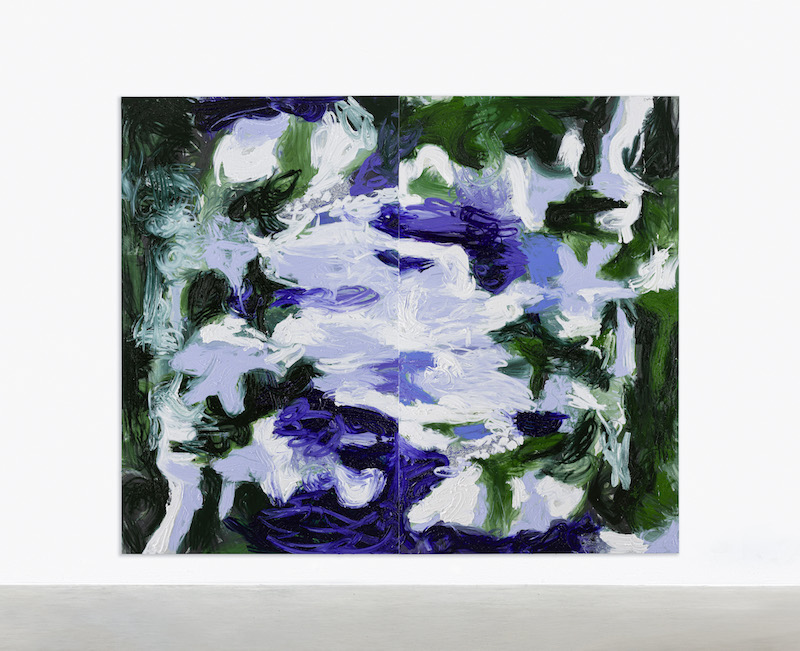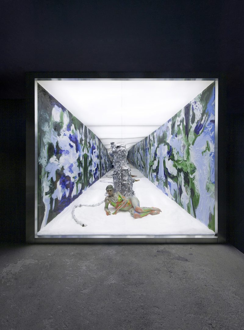 In the way that it holds the outside world in abeyance, ‘Mortal Coil’ is interested in creating a self-sufficient cosmos with the originary tasks that accompany mythical beginnings, like naming and mark-making. Many seasons and biomes come together in a tight contiguity, with a resplendent white sand decorating the floor and richly encoded wallflowers — an impasto of cirrus, moss, and periwinkle — covering digital print images on the sides. The far-side mirror swerves so that the visions of the room not only reproduce themselves but also proceed along the glass’s curvature with the uncertainty of a dark highway bend. In the middle of the exhibition room, there is a sculpture, cast in aluminum, that resembles a large piece of platinum ore with padlocks and oversized barbell piercings wrought into the mold. Framed by a thick powerful braid at its base, the sculpture bears a range of somatic traces: the clay of the original form looks kneaded, massaged, whacked, scratched and cajoled into its altar-like shape. When shown in the dark, the sculpture’s phosphorescent paint gives off a heat-map of physical touch.
