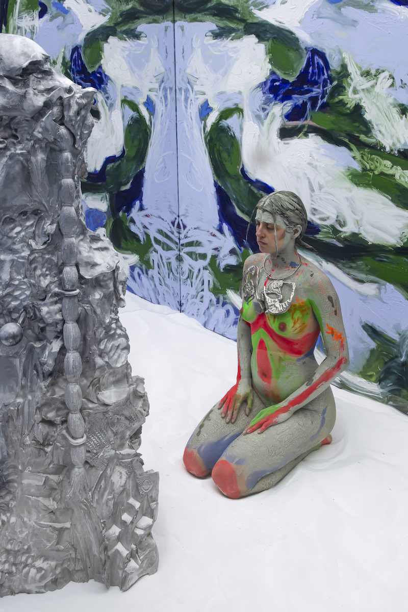 Few pieces so clearly deserve the epithet “Gesamtkunstwerk” as Donna Huanca’s ‘Mortal Coil.’ Asked to describe the bewildering, otherworldly nature of this enclosed installation at Number 1 Main Road, I would say that its mixture of painting, sculpture and performance comes closest to resembling a devotional space without a deity—a crypt, a mausoleum, a crevice between life and death, a site of a dispersed séance.