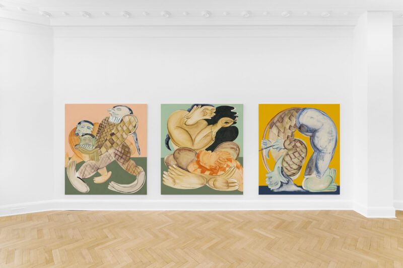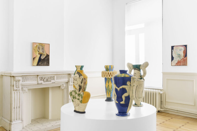Scattered across the three floors of the gallery are portraits of figures emblematic of Bay’s painterly world. With warped physiques and blurred faces, as if captured mid-metamorphosis into chimeras of past and future selves, these characters narrate the show’s story of upheaval and transformation. In two of the paintings, the depiction of a head on a platter evokes the biblical tale of Salome’s execution of John the Baptist and its artistic interpretations, as well as guillotine beheadings during the French Revolution. In addition to paintings, five amphora-shaped sculptures overwrite the ancient Greek and Roman legacy with that of the 16th-century commedia dell’arte. The latter is summoned via the rebellious figure of Harlequin, a boundary-crosser who playfully disobeys rules and conventions.
