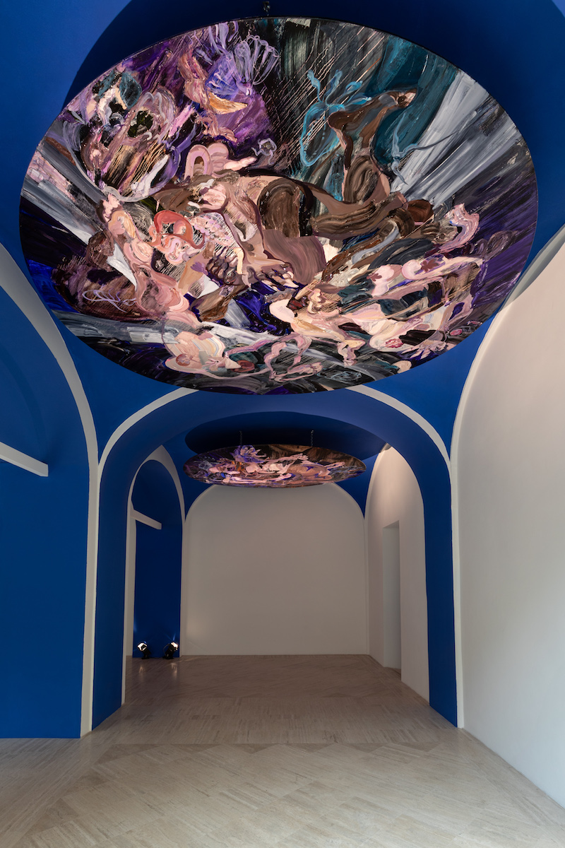 Conceived during a residency at the gallery, the show is heavily influenced by and imbued with religious and art historical references from the city. This is particularly evident in the four oil paintings—’Casiopea,’ ‘Andromeda,’ ‘Hydra’ and ‘Berenice’—that adorn the ceiling of the gallery’s second room. I am immediately struck by the grandeur of these paintings, each measuring an impressive 330-by-340cm. To fully appreciate them, I have to crane my neck, an act reminiscent of gazing up at the ceilings of Roman churches, which number no less than 900 and often feature stunning ceiling paintings.
