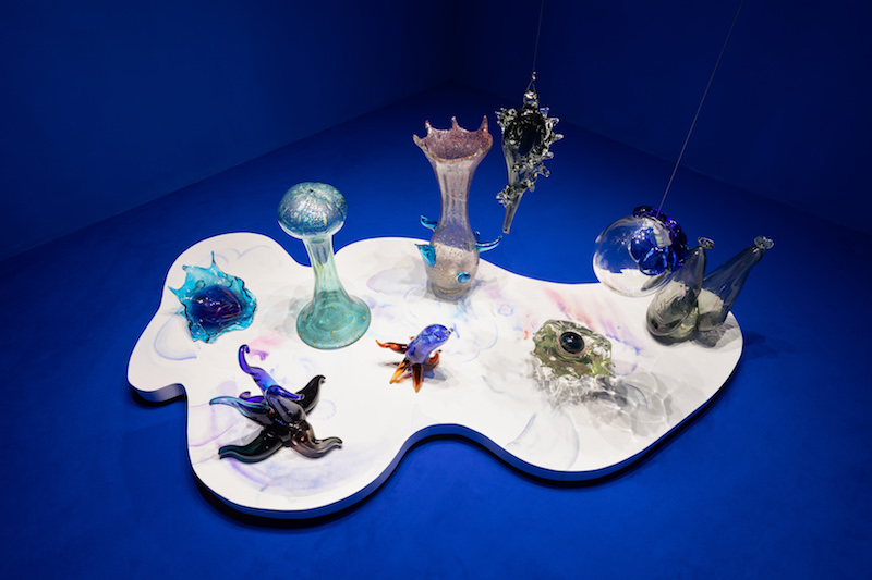 Tucked away in what can aptly be described as a grotto is a collection of colorful glass sculptures titled ‘Tesoros.’ Mynerva collaborated with a master glassblower in Venice for a single day to create these works, each impressively formed without a mold, using only the breath. The artist’s choice to use breath in the creation process draws again on religious iconography, evoking the idea of breathing life into something, like the divine act of God breathing life into humans. To me, the sculptures resemble sea creatures, an effect enhanced by the water-like rippling reflections beneath them and the deep Yves Klein blue that envelops the room. Despite finding them lovely, I struggled to find the connection between the works and the theme of the artist’s illness, something which had shown itself so clearly in the other two rooms.