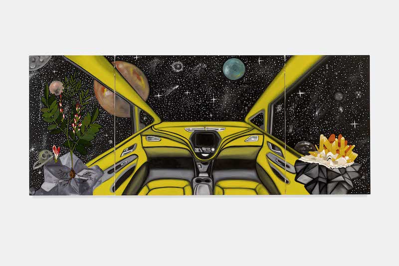 Visitors will see the signature canvases featuring the helms and visual displays of spaceships, rocketry and luxury cars. Previous to this exhibition, I wondered about the narratives they were depicting and the aesthetics they were embracing. Were they perhaps buying too easily into accelerationist dreams of better living through circuitry? Jaeger addresses concerns such as these head on in her interview with Robertson, noting that the homogenised, blanched, Steve-Jobs-ified aesthetic of the “futuristic” is both racialised and militarised in insalubrious ways. Jaeger places the viewer in the driving seat of many of the works, gazing out on a windscreen of distant stars or heaving jungles, occasionally receiving flowers from the passengers window.