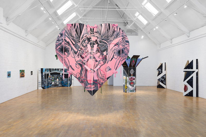 The hearts, though, perhaps more than anything, raised the stakes of the Modern Art exhibition to an even more intense pitch. Hearts are everywhere in Jaeger’s works. They’re splayed on the floor of the exhibition room. They’re strung into a space at the bottom of a structure that appears to depict engine cylinders. They’re floating into the darkness of space as two hooded and robed figures play some unfathomable game of intergalactic Double Dutch. And there’s a massive heart overhead as the visitor enters the space. The frontispiece of this heart is green and adorned with the iconography of the car engine again, on the back a mixture of pink harness straps, and images that are quasi-technological and quasi-organic, tendrils and voids, Lee Bontecou and Celia Vicuña, but most of all Jaeger herself. ‘A future in the light of darkness’ is as good an introduction to Jaeger’s works as could be hoped for. Perhaps surprisingly it is an even richer experience for those already familiar with the works, as it is the rare occasion she is allowed the physical space for her works to fully flower.