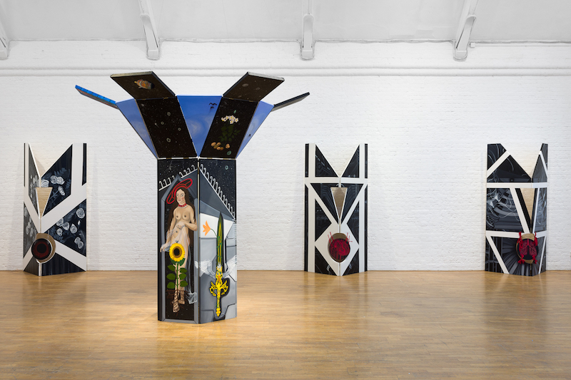 Such ecologies are sometimes more literally realised, as in a suite of mechanised boxes referencing various art historical takes on “the four seasons.” In the works, cubes with seasonal depictions open and close by means of a motorised engine. They blend the futuristic, the organic and the oneiric in an almost hypnotic polyrhythm as they grow and shrink.