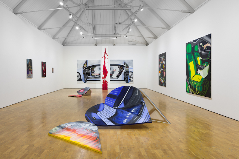 “Desire is a disaster,” Frieda Toranzo Jaeger states in her interview with Jessie Robertson, the curator of the exhibition ‘A future in the light of darkness’ at Modern Art Oxford. It is a succinct summation of our moment in history, wherein a Babel Tower of irreconcilable desires are rapidly hurtling humankind towards destruction. Jaeger is referring to works from the exhibition featuring stylised hearts broken open into panels and displayed on the gallery floor. These heart disasters, or heart crashes, provide a powerful metaphor for Jaeger’s philosophical project, but also an emotional centre for an exhibition richly infused with art historical concerns and futurity. These hearts are painted with iconography that populates Jaeger’s exhibition more broadly: car interiors, warm reds and forms that evoke stellar surfaces or energy cores. There is, inevitably, a soupçon of JG Ballard in the air, but while many artists who reference Ballard these days foreground the dystopian currents of his works, Jaeger seems tapped into the less heralded Romantic Ballard, whose capacity to depict longing and desire were as profound as his jaundiced eye for conjuring the ways in which humans would bend technological advances to their most base urges. Jaeger goes beyond wearing her heart on her sleeve, however, externalising and disembodying them completely, but they feel all the more living for it. They are religious icons of a kind perhaps, but for religions no one has yet dreamed of.