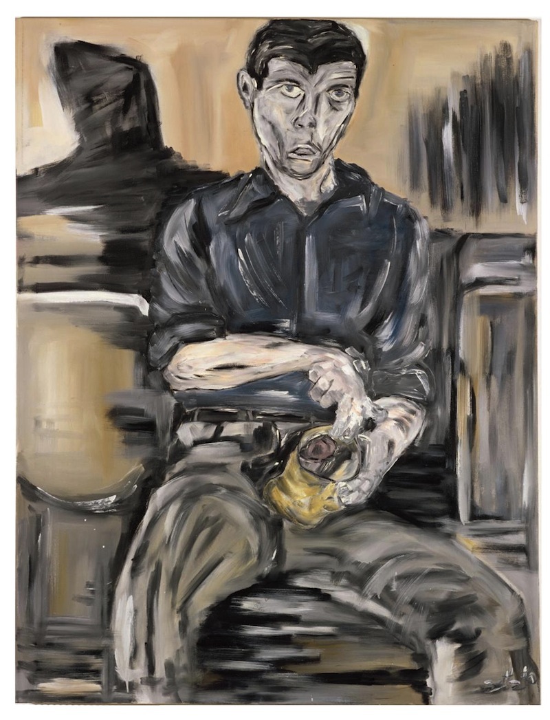 Werner Büttner: Selbstbildnis im Kino onanierend, 1987, oil on canvas, 150 x 115 cm / 59 x 45 1/4 in // Courtesy: Contemporary Fine Arts