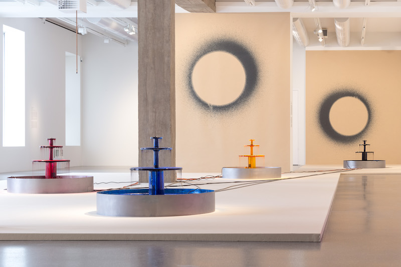 The most striking element of her exhibition at Palais Populaire in Berlin is the four-fountain installation ‘Infinite Energy, Finite Time.’ The fountains consist of three-tiered plates, with ink constantly spilling over the edges and running down into a pool collecting in a basin at the bottom. Each fountain flows with ink in one of the four CMYK model colours used in printers; a tar coloured black, cyan, magenta and yellow. Around each fountain small droplets that have bounced out of the fountain stain the white sheet on which they sit, the circles complementing the ones on the walls above.