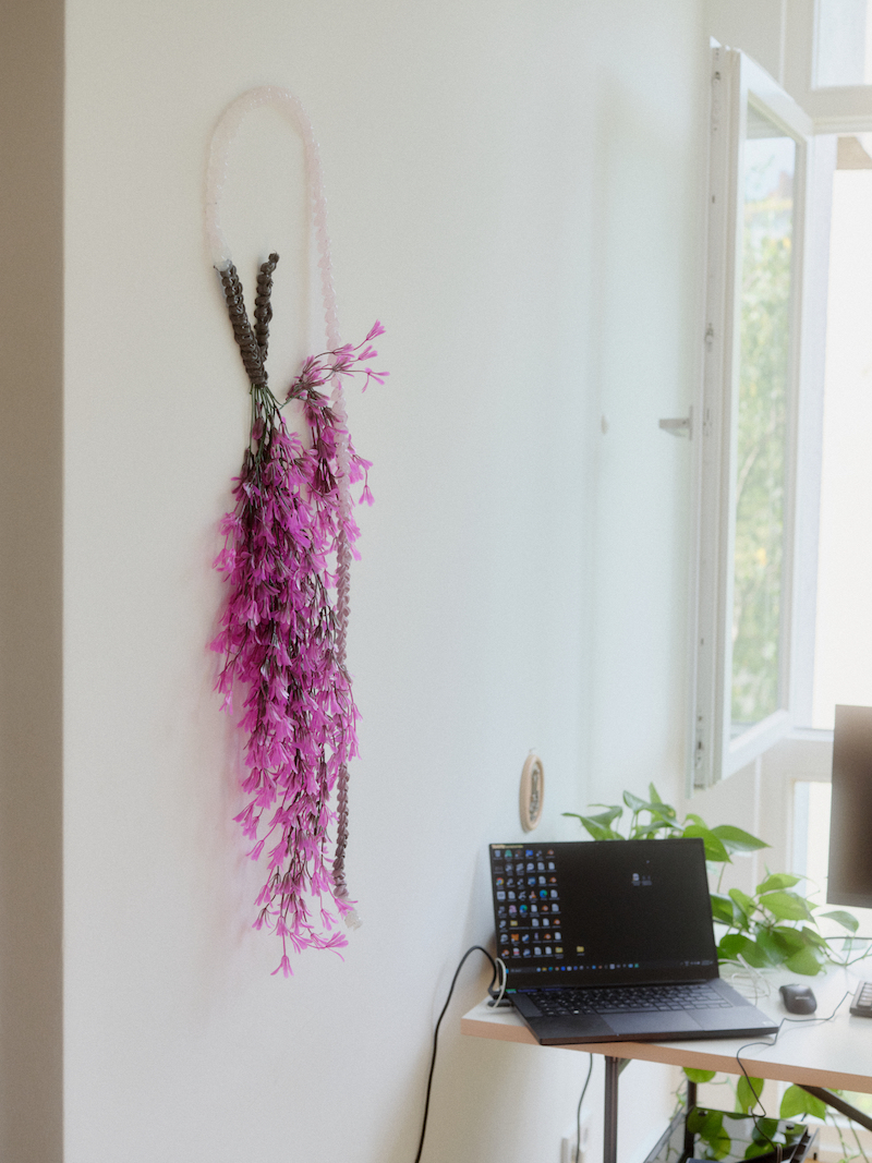 Fries builds speculative posthuman worlds where nonfemale bodies are “hacked” with pregnancy, species are brought back from extinction and babies are bred outside of human wombs. These are all soon-to-be-realities that fascinate Fries and inform their work, which lies at the intersection of nature and technology, transcending boundaries through speculation. By questioning the idea of what is natural, Fries points to the fact that nature and technology have been intertwined for millenia: “since we started using tools, we have influenced nature. I like to think that we cannot separate nature and technology and we are all part of this techno-nature sphere, as Rosi Braidotti calls it.” Combining VR with performance, Fries’ work also blends virtual and physical spaces, fusing digital and performing arts. “I’m interested in the Phygital, which I think is going to be our ultimate reality soon. Everything we are doing is going to be virtually augmented. In my work, I use it in the context of creating worlds that bring the digital space and the physical space together.” The performance element is, of course, absent in the studio today. Yet flowering magenta silicon umbilical-cord-like sculptures dotted around the room—prototypes Fries is developing for their upcoming performance during ‘Unleashed Utopias’—act as reminders that keep us tied to the physical realm.