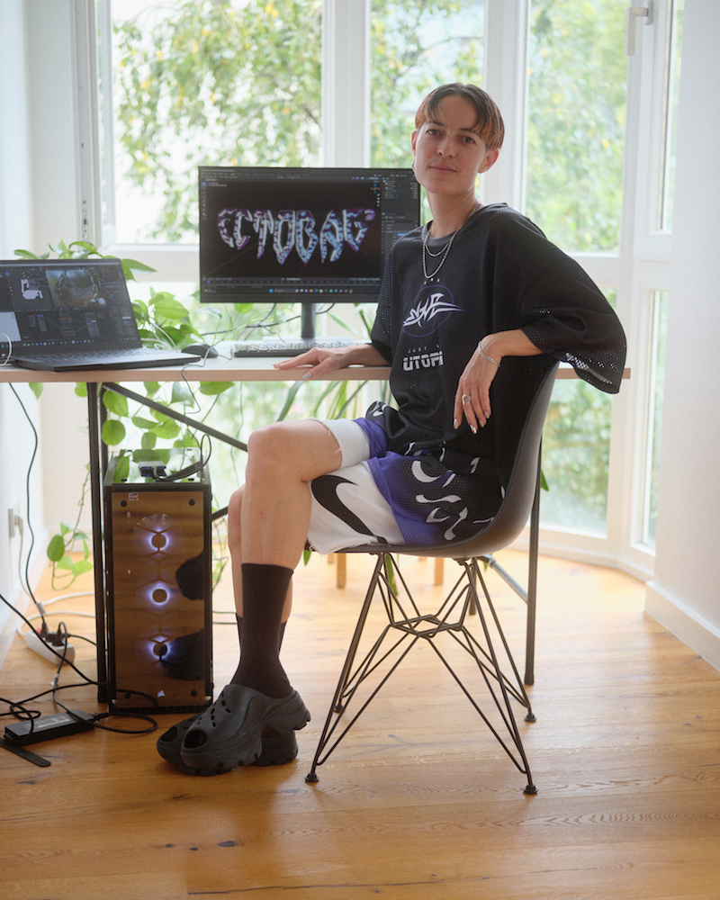 Climbing the stairs to Anan Fries’ Kreuzberg flat, which also houses their studio, I lament the fact that these visits always seem to coincide with the few unbearably hot days that this summer has offered. But, once inside, the space is cool and Fries hands me a glass of water. The apartment is open plan, bright and modern. There’s a sense of it not having been lived in long, which is confirmed when Fries tells me they moved in recently. A Togo sofa takes up most of the living room and the greenery filling the large windows is so luscious and imposing it seems as though it might break through the glass at any moment. The studio itself, which leads off the hall, is a relatively small space. Some craft supplies on the shelves are among the only markers suggesting that an artist works here. This is perhaps telling of the media Fries works with, which includes VR and performance, the latter often rehearsed outside of the studio. Two screens dominate the desk and a lit up computer case glows purple from underneath, peering out like a living thing.