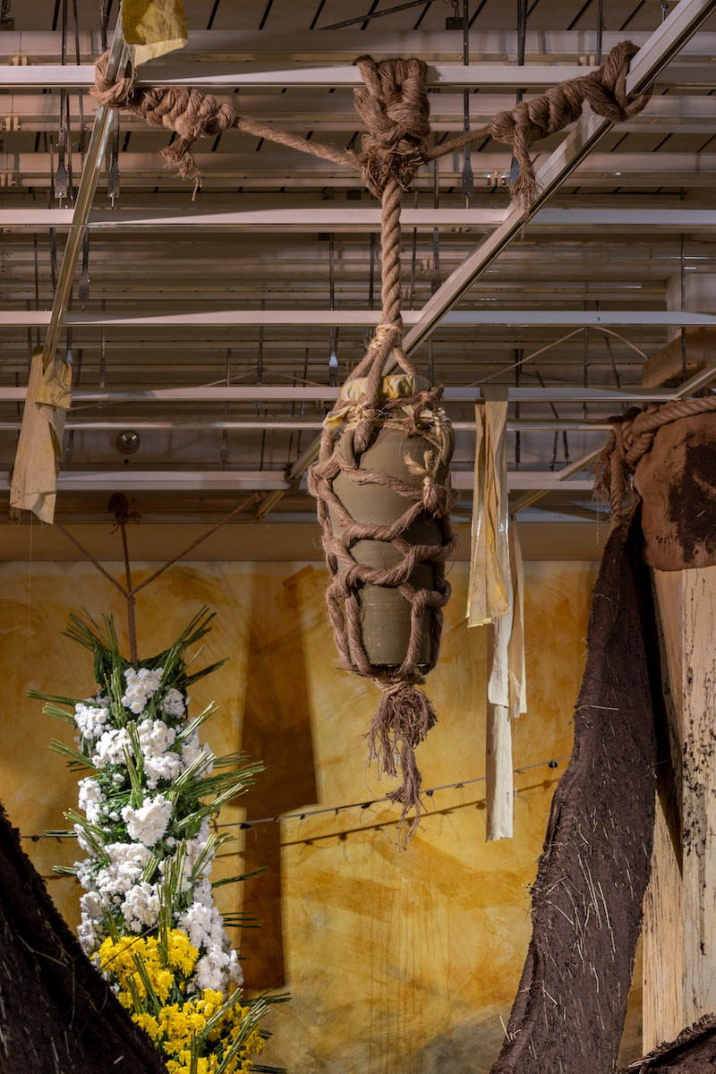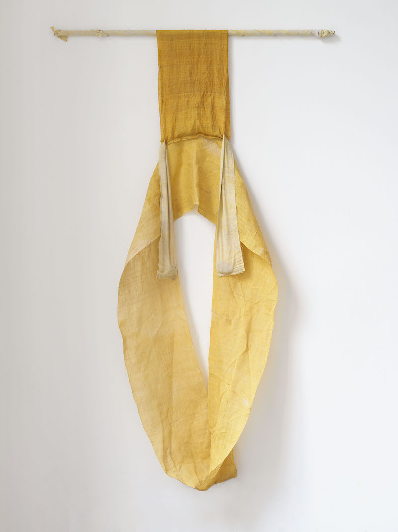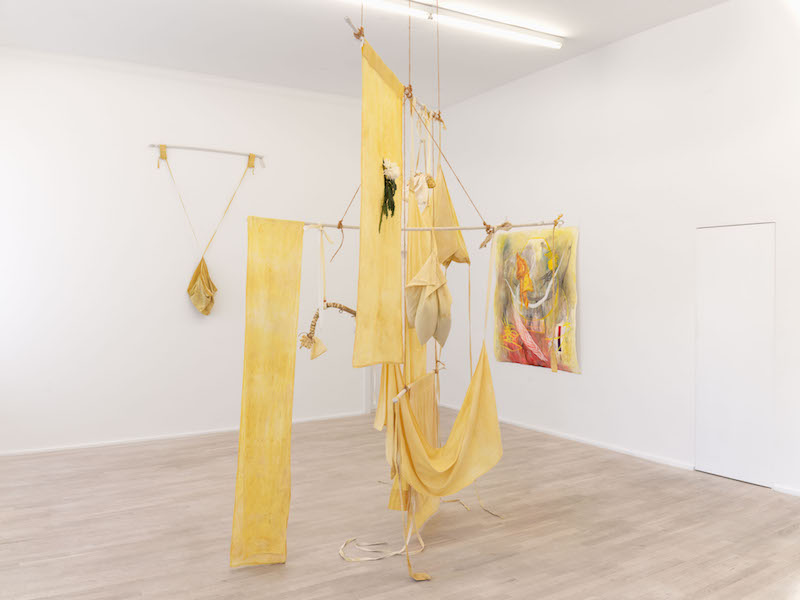 DL: I began making these installations with flowers and sprouts. They all looked very bright initially. But then, after a few months, of course, they all turn beige-brown. I wanted to bring back color into the pieces, but stick to my principles at the same time. It’s important for me that all the materials I work with can degrade over time and are easy to come by. I began experimenting with materials I could find at the grocery store. I tried making natural dyes with different spices. I settled on turmeric, which makes for a bright yellow dye. I used it to paint cloths, which I then put in the sun to dry. The color had completely vanished when I picked them back up. It had lost its saturation by being exposed to light, and this transient quality fascinated me.