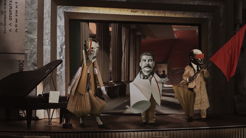 WK: In all of the projects I do, there always has to be a meeting between something outside in the world that is bigger than the studio, and some material in the studio, which is used to think through the question. In this case, it was the question of artists and power, of Shostakovich in the Soviet Union, of Mayakovsky shifting from great enthusiasm for the revolution to shooting himself 12 years later. There was something about the cardboard world we were making for the film for the Shostakovich symphony that called for collage. I made some drawings for masks for the characters, but as we filmed and looked at them, a more photographic language spoke better to the music and themes we were following.
