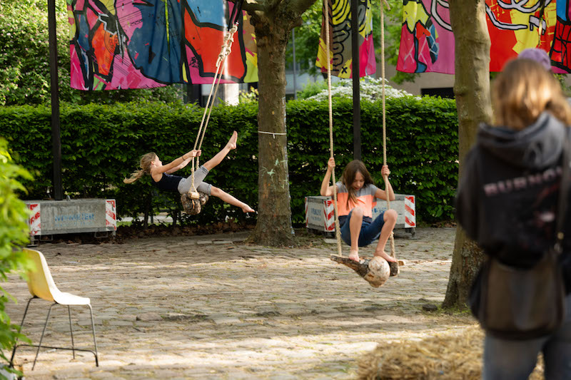 JW: People often ask me what is radical in these playgrounds? On the one hand, a swing is a just swing, you are welcome to use it. You do not need to read any curatorial description to understand or enjoy it. But it is also a swing that wants to change the world, through the art and activism of Joar Nango, Sámi architect and artist, and his idea of how to re-organize knowledge based on his concept of “indigenuity”—a combination of the words “ingenuity” and “indigeneity.” He is working with what is already there in the most respectful manner, no drop of oil, no centimeter was added. This and other playable objects come back to the latin origin of the term radical: radix, the root, being rooted, standing for something. Kids look for “treasures” in a sandbox-cum-excavation site in an installation of School of Mutants, which opened the ground where the ethnographic museum once stood, creating a decolonial sandpit, mutating meanings, digging for truth, getting your hands dirty in the sand, restituting debris, objects and meanings. And some of these kids will take those fundamental questions, of how the museums need to reinvent themselves in the future, further.