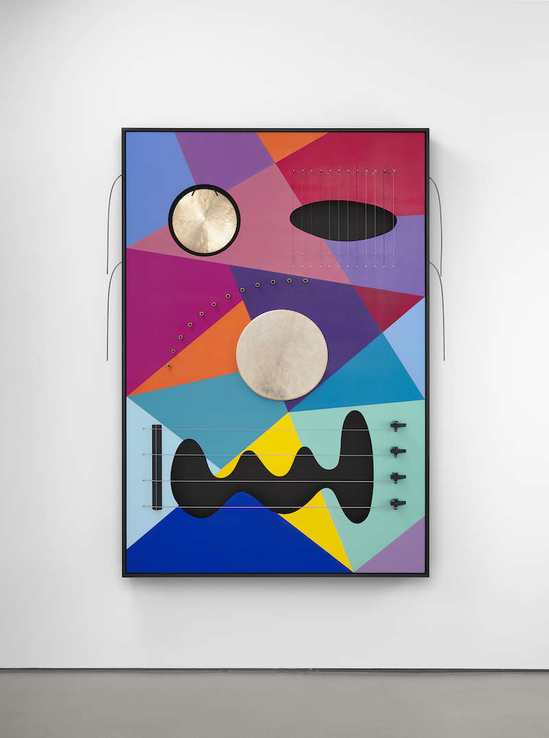 Nevin Aladag: ‘Vibrating Images, thundergong,’ 2024, acrylic paint on wood, gong, harp, thunder drums, pan flute, drums and bass guitar, 174 x 133 x 22 cm // Courtesy of the artist and Wentrup, Berlin, photo by Matthias Kolb
