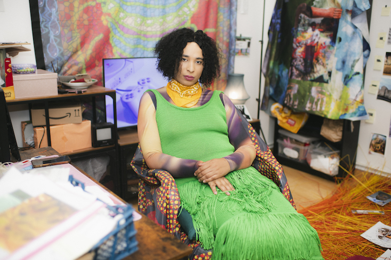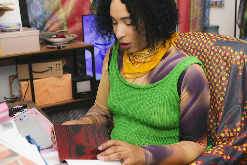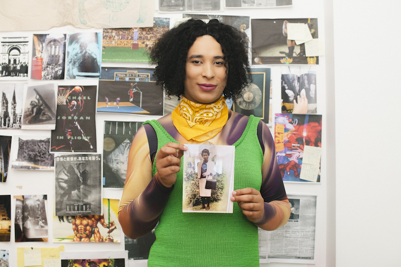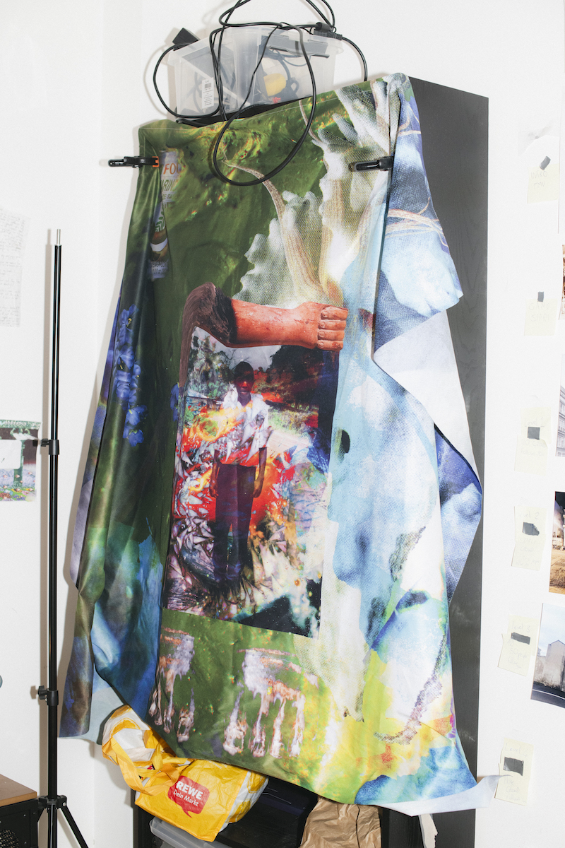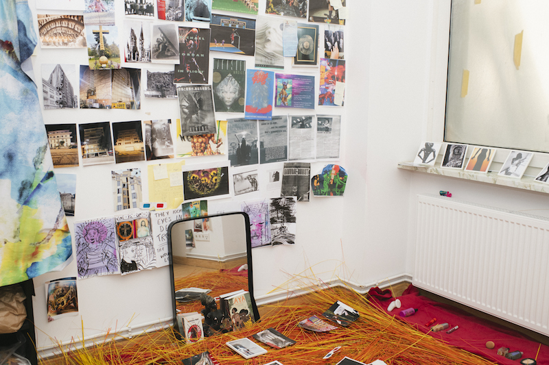 By the time I reach Danielle Brathwaite-Shirley’s studio in Tegel, I’ve been travelling for about an hour and crossed half of Berlin, and I feel slightly worn out by the early July heat. As I walk in, she promptly offers me a glass of water and we chat for a bit while I catch my breath. She is friendly and hospitable, and her home matches her lively energy. We head to the studio, which is a small bustling room tucked away at the end of her apartment’s hall. Its surfaces are covered in images, drawings, sketches. Flags and printed cloths drape the walls and door; half of the floor is turned into a sort of altar, made of a bed of bright orange straw, on which are scattered more pictures, a crucifix, cosmetic products and make-up, a measuring stick and a medium-sized mirror that leans against the wall and reflects our shoeless feet. “I’ve been looking at religious iconography and why people are so drawn to religion and spirituality. A lot of trans people I know, especially, are drawn to a kind of spiritual way of seeing the world and talk about themselves as deities,” the artist elaborates. She’s been envisaging the idea of “a lost god returning to earth to change the physics of how everything works by centring Black trans people,” and her studio encapsulates the potential of such a prospect.