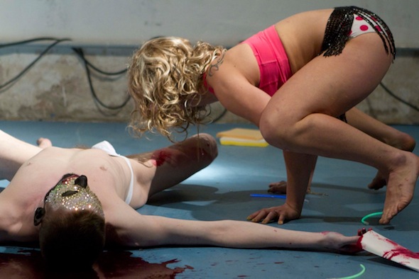 The Feature presents works in progress, improvisations, videos, lectures, and group actions—all of these things in a single night. It’s packed with people and propositions. When its time for Flo and Vincent to perform Wade, who has previously told the audience to move in to see the work of Ligia Manuela Lewis, a stationary solo which sustains a choreographed state of climax, now tells us to move back. To the grumbling sounds of the public sitting or standing in various contortions, he adds that we will be grateful we did. Once all are resituated in a new if no less uncomfortable positions, enter Flo and Vincent. Vincent is in a bedazzled mask, cock sling, and glow-in-the-dark bracelets and Flo in an early Britney-style get up, pink sports bra and panties, with beaded tassels hanging around her hips. Flo wears a thick blond wig and moves in and around the audience with a burning stick of incense.