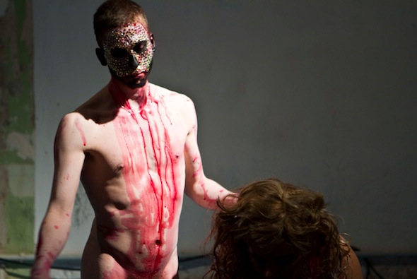 I get the sense that the word “provocative” becomes a way of shutting down deeper contemplation of the work. People tend to have a lot of resistance to work that they deem to be “trying to be provocative”. Along with this diagnosis of the work comes the all too easy response that nothing is provocative anymore since everything has been done. BUT people would never say this if they weren’t provoked in some way! I am highly suspicious of this “too cool” response. I think it stops people from seeing the potentially formal aspects of the way the artwork functions conceptually or aesthetically. While I found a certain aspect of your show physically difficult to watch (i.e. Vincent gagging himself and puking what looked like blood was making my stomach turn), I found the imagery in that moment quite beautiful actually. Can you speak to your relationship to ideas of beauty? And what is your response to the question of provocation in relation to the work you make?