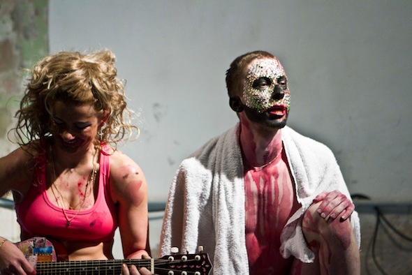 This is the set up and I won’t disrespect the piece by trying to describe it. I will say that the work made me happy and not because it was a happy work but because in so much performance that I see (and love and make)—that uber-intellectual stuff, steeped in theory, well-versed in art history, tortured and tragic—I see the fear of doing it wrong, referencing the wrong theorist, enacting the wrong position in relation to ideas of representation, maintaining the wrong degree of distance, etc. Not here. ‘Kein Applaus für Scheisse’ didn’t give a fuck about that. It gave a fuck about other things, about beauty, about obsession, about trash, and about us, the audience, from what I could perceive. After a couple of weeks passed and I was still thinking about their show I managed to obtain their email addresses and caught up with them when they were back in Amsterdam, where they live. I honestly didn’t know what I wanted to ask them. I just wanted to start an interaction and see a little bit of how they work so I asked some questions and they each responded to me individually.