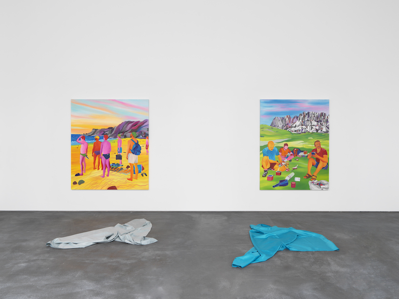 I spent more time thinking about this idea of boundaries and their transgression. It wasn’t just the shower curtain that extended the painting into our space and time, enveloping the painting and enveloping us. The canvases (or linens) seem thick and protrude by a couple of inches. Their sides are occasionally painted, either continuing the primary image or using block color to block access to what lies beyond. When looking at ‘The Chill (Mat, Elliot & Kevin in Zipolite),’ I, for a moment, felt unsure where the painting ends and the wall starts as the dazzling pattern forgot to stop.