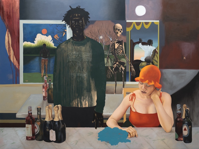 Nigerian artist Eniwaye Oluwaseyi is a self-taught painter who works primarily from visual memories and intimate photographs of family and friends. In his studio, inspirational stills from Jean Cocteau’s 1932 avant-garde film ‘The Blood of a Poet’ hang on the walls, next to his canvasses, which feature people sitting or standing in portrait-style arrangements, often in surreal surroundings. The Cocteau film points to an artistic interest of Oluwaseyi’s: examining the dissolution of personal identity through the introduction of surreal elements into more classical portraiture. A Nigerian woman with albinism appears in many of Oluwaseyi’s paintings, contrasting the mostly Black figures but still representative of his home country—a fact that he describes as challenging for her, as a member of a marginalized community within Nigerian society. Oluwaseyi has featured other members of the albino community in different works, as a gesture of inclusion as well as a commentary on the African-American or European experience of underrepresentation within the art historical canon, in contrast to Oluwaseyi’s own visual experiences growing up in Nigeria.