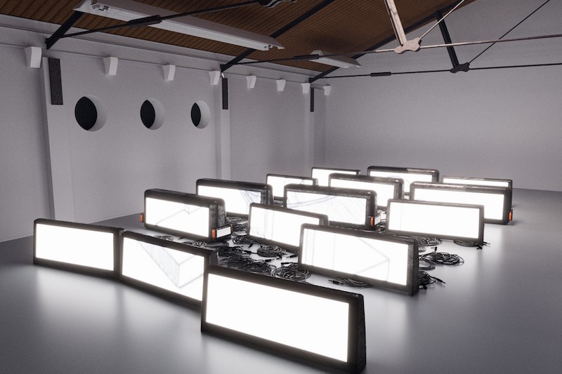 Lately, New York-based artist Jessica Wilson has been repurposing taxi tops from her city, removing their original advertisements and reanimating their lights with her own protocols. In her studio at Rijksakademie, a pink-hued taxi top hangs on the wall directly in front of her door, appearing like a marquee or display without any particular message. Wilson showed this series in a duo show at diez in Amsterdam last year, with Will Thompson, entitled ‘Dream State,’ which points to the oneiric quality of the pieces, removed from their functional purpose. With the taxi top series, she continues her research into urban lighting and its significations. Wilson’s practice otherwise often consists of computer-generated animations and 3D-rendered flat works, examining everyday mediation through screens and our tactile relationship to them. In a recent computer-generated animation, ‘Perfectly Clear,’ shown in London last year, Wilson displays 23-minutes of a disembodied hand, trying to clean a dirty window, using various tools and methods. On the floor below the makeshift marquee in her studio, printouts of film stills featuring CGI explosions form a pile of inspirational visuals for her works-in-progress. In a recent interview, Wilson remarked that she feels strongly about “using CGI a bit differently.” Not looking to replicate Hollywood visual effects, she adopts a more poetic or somatic approach, hoping to break habitual responses to viewing CGI.