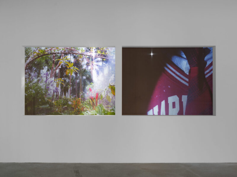 The uncanniness carried on at Galerie Molitor, which hosts Diane Severin Nguyen’s exhibition ‘Spring Snow.’ I arrived there as something of an uncanny presence myself, joining the artist’s private tour of the show uninvited. Fitted with curtains made of sheer white material that reappears as ruffled fabric lining the staircase, the raw concrete interior of the gallery feels softer and more mysterious, signalling both a cue of femininity and a veil of illusion. On the ground floor, a two-channel video projected on silk panels shows artificial snow falling over a jungle, juxtaposed with footage of a rotating display of schoolgirl-uniform-type outfits. Notions of purity rub against sinister undertones, creating an eerie atmosphere that can’t be easily pinned down. Nguyen points out that her works resist identification and resolution. Instead, they teem with possibility. Downstairs, a series of LightJet prints—photographs produced by immersing laser-exposed paper in a chemical bath—double down on illegibility. The images share a distinct commonality: a layer of white substance covering the photographed objects, adding texture that is echoed in the tactile quality of the white velvet–lined frames. As Salomé Burstein notes in her exhibition text, “the snow or sugar here [acts] as contour to enhance all features. Nguyen avoids photography’s tendency to flatten.”