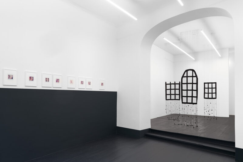 For this Gallery Weekend, Šejla Kamerić’s exhibition was on my must-see list, and so I made my way to Galerie Tanja Wagner. Her work, for me, is a personal revisiting of ancestral beauty and pain, and thus, feelings bubble up quicker than thoughts, and memories override the analytical gaze. ‘In the Darkened Rooms’ features a series of polaroids capturing thorny branches pressed against the artist’s bare thighs—an act of exposing pain inflicted on women as well as of their repressed desires, both kept in the shadows of private lives. Stunted by small format and repetitiveness, their poetic refrain reveals itself to the viewer only upon close inspection. The branch motif repeats in the form of a seemingly fragile sculpture made of bronze. Kamerić’s new installation of three black crochet objects traditionally hand-crafted by women in Sarajevo rounds up the exhibition. These beautiful pieces, adorned with charms, appear either as entrapment or as a fort. They make me think of my late grandmother, who spent countless hours crocheting, pouring both love and frustration out into her precious handwork.