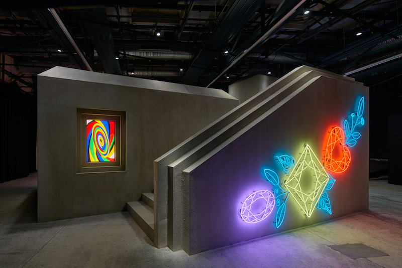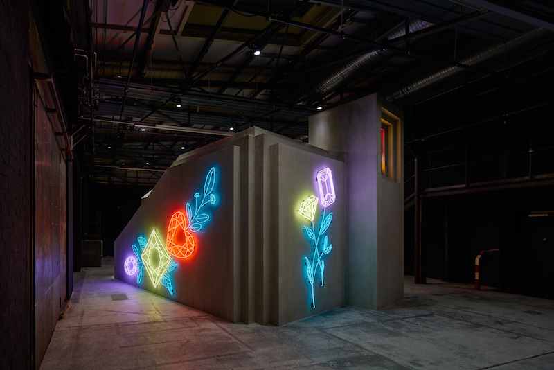 Going to an exhibition the morning after its opening night always feels like having missed the main event. But there is a melancholic beauty to it, too. A night just out of reach—the faint smell of smoke lingers, DJ set times still pinned to the wall next to the empty bar. The absence of people is palpable. A muted jingle meets me halfway down the stairs into TRAUMA’s central theatre space. Visitors are sparse this morning. They arrive reluctantly, testing the boundaries of the installation, uncertain whether to engage with it or observe it from a distance. They begin to move around the brutalist structure–its steep, angular geometry dimly lit, a solid mass of concrete imposing its presence. Stained-glass windows carve openings into the unyielding, raw surface of the structure, infusing it with soft hues to counterbalance its starkness. Neon lights in the shape of flowers and diamonds crawl up its sides, decorating its monumental expression. Together with the light melody, they counterpoint the weight of the architecture.