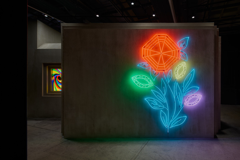 While the bunkers of the Atlantic Wall might be decorated with overgrown grass or graffiti, Kjær’s installation features neon tubes shaped like diamonds sprouting from flowers. The deliberate choice of such an incongruous and alien element underlines the artist’s intention with the medium. Neon signs are attention-grabbing precisely because they stand out so starkly from their surroundings. Their use here opens up a range of interpretations, inviting dialogue on beauty and commerce, nature and artifice, high art and low culture, or marketing strategies and the commodification of nightlife spaces. These neon forms also resonate with the visual language of contemporary cinema, evoking nostalgia and retro-futurism, particularly associated with the aesthetics of the 1980s, when neon became an iconic visual marker in genres such as sci-fi and noir.