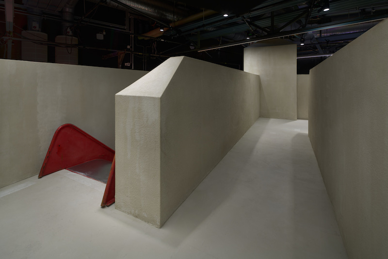 The structure’s distinctive triple-layered stepped walls evoke a design commonly used for reinforcement in military fortifications worldwide. On the other hand, its steep metal slide, cold steel framework and hard-edged brutalist aesthetic evoke Soviet playgrounds as symbols of state power and communal play. As the curatorial text explains, abandoned bunkers along the Danish coast became the artist’s accidental playground as a child. These bunkers form part of the Nazi Atlantic Wall, a chain of fortifications built through slave labour between 1939-41 along the coast of north-western Europe. With their origins in a grim chapter of history, bunkers reflect a temporal dissonance. Their decay materialises the passage of time, while their enduring presence invites repurposing. It is the schizophrenic tension in which these structures exist that seems to fascinate the artist most: how environments shaped by political ideologies and military function try to be reimagined.