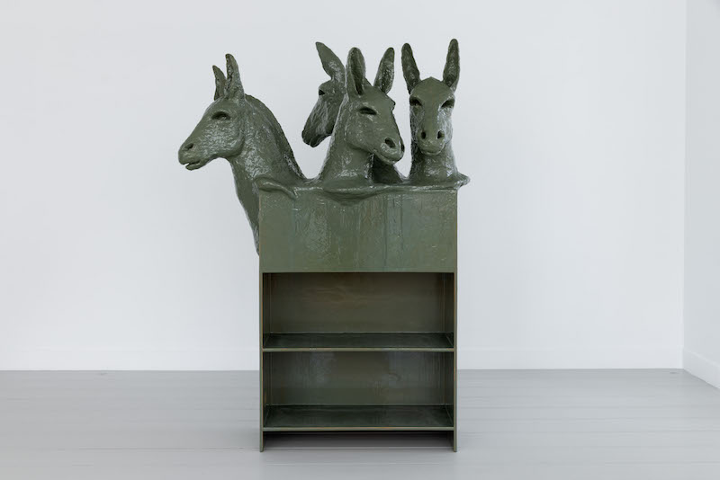 Nuri Koerfer: ‘Gestell (shelf, four donkeys),’ 2023, wood, papier-mâché, resin, 180 x 130 x 90 cm // Courtesy of the artist and Melas Martinos