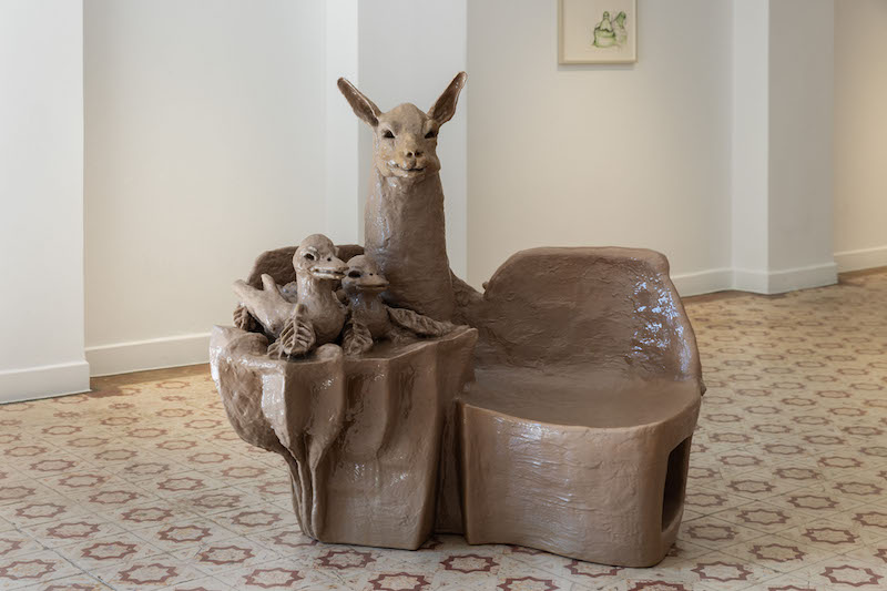 Nuri Koerfer: ‘Thron (lama and quack quack),’ 2023, styrofoam, papier-mâché, resin, 120 x 126 x 70 cm // Courtesy of the artist and Melas Martinos