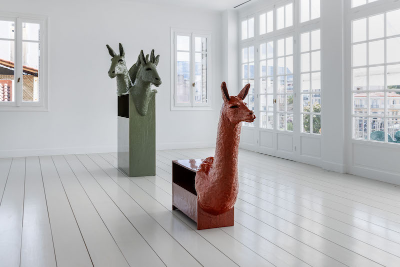 Shaped as ducks, crocodiles or donkeys, Koerfer’s ergonomic sculptures might recall decorative figurines, like my grandmother’s glass and ceramic duck collection, or Meissen’s animal-inspired porcelain. At times, they look like theatre props or very peculiar pieces of furniture. The sculptures seem to have a life of their own, and they can accommodate objects or people in and on top of them. Sitting on them is allowed and interaction is welcomed—Koerfer’s sculptures are a child’s delight, as I witnessed at her exhibition at Melos Martinos earlier this year, where the gallerist’s children cheerfully played with the works.