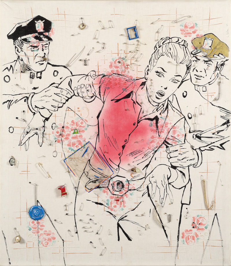 Polke was a brilliantly imaginative artist, and his gift for making found objects do his bidding is still surprising today. Safety pins, for example, stipple the surface of his ‘Untitled (Sicherheitsverwahrung)’ [Preventive Detention] (1979). Alluding to the then-emergent punk movement, the draping of these reflective metal objects have a lapidary suggestiveness all their own. Sculptural as well as cultural, the theme of the work, a young woman running from police, seems almost like an afterthought, a prop, in light of the numerous gestures amplifying the picture: grimacing police officers in 1950s-styled uniforms, the rockabilly workers clothes the woman wears. Instead of making a too-easy statement about feminism, Polke seems to be toying with the neutrality of the image, taking it as a cartoon-like effigy and twisting it so that it unpacks differently with each additional viewing. It’s this mindfulness of the imbricated relationship indeterminacy bears to pathos that makes Polke’s themes and imagery so resonant today.