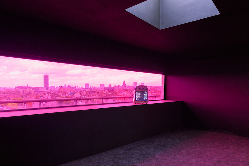On a small, princess-pink television on the fifth floor of the WIELS Contemporary Art Centre in Brussels, an animated bear smokes a blunt as a spectral voice recounts a run-in with the police that nearly devolved into violence. The film is Nigerian-American poet Precious Okoyomon’s ‘It’s dissociating season’ (2019), and the narrator is her brother. Rendered on a Disney-branded TV, and shown thousands of miles from the U.S., Okoyomon’s defanging of America’s racist, state-sanctioned carceral system is darkly funny, and deeply surreal. Though that may be, in part, thanks to the hazy glow of pink-tinted windows framing the small room that Okoyomon’s work occupies.