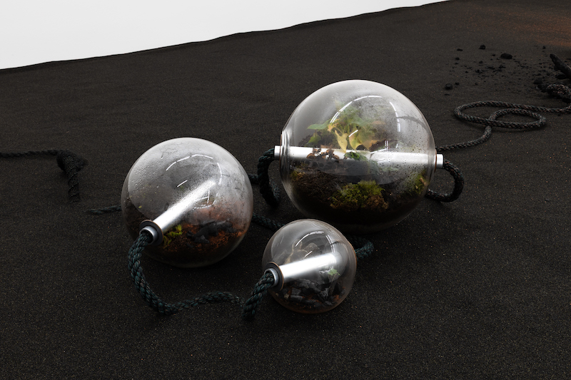 One of the most literal examples of these themes can be found on the first floor, with Nigerian artist Otobong Nkanga’s tableau of regeneration. On a stretch of soil with volcanic hues of charcoal grey and rusty brown, a burnt tree reaches up toward the sky, while a handful of self-sustaining terrariums rest on the ground. Here lies new life, ensconced in blown glass bubbles. Affixed to a nearby wall, Nkanga’s ‘Until Then’ (2023) offers a brief poem etched into a concrete slab: “While we stand, while we wait, while we watch, we can’t yet mourn …until then.” It’s a message as concise as it is timely, given today’s ecological collapse and political turmoil. “How can we find that space to mourn what has been lost, and to actually nurture and take care of these ecosystems that keep resisting,” Dati asks us during a discussion of Nkanga’s work.